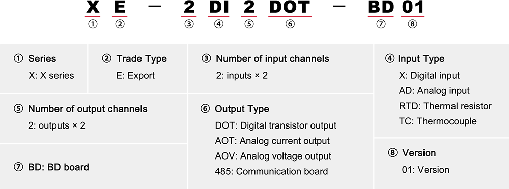 | 1 | XE-2DI4DOT-BDO1 | Bóng bán dẫn 2DI/4DO, 24VDC | đầu vào kỹ thuật số ×2 & đầu ra bóng bán dẫn ×4 |
