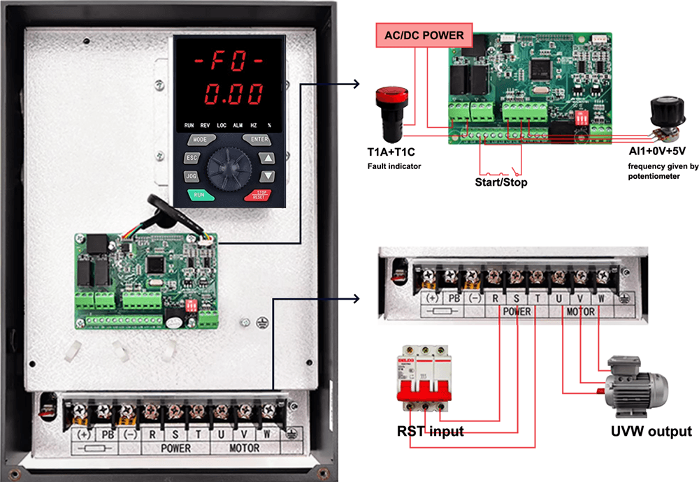 | Tín hiệu cài đặt tần số | Bảng điều khiển tích hợp | Công tắc màng (nút), núm điều chỉnh tốc độ (chiết áp) |